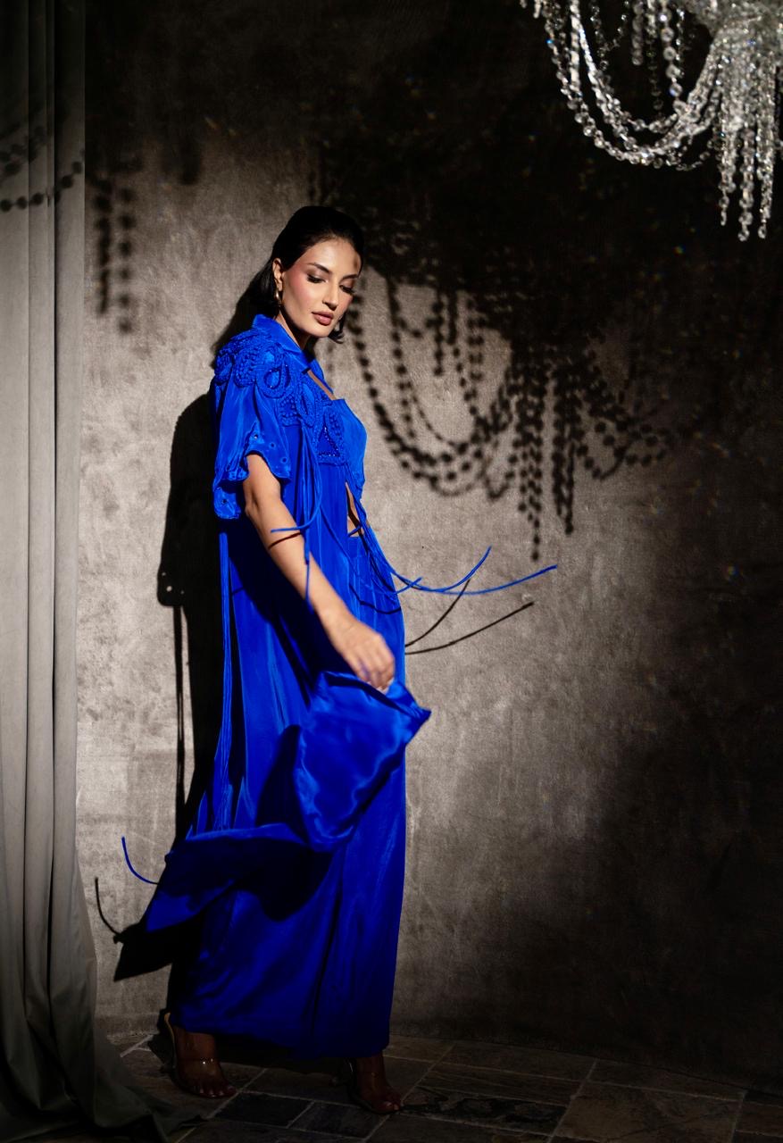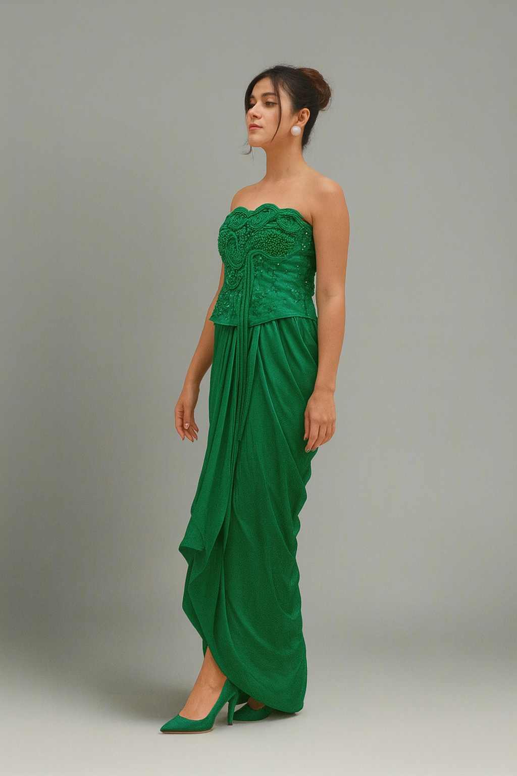 Draped corset dress with intricately handcrafted woven appliqué with pearl details.