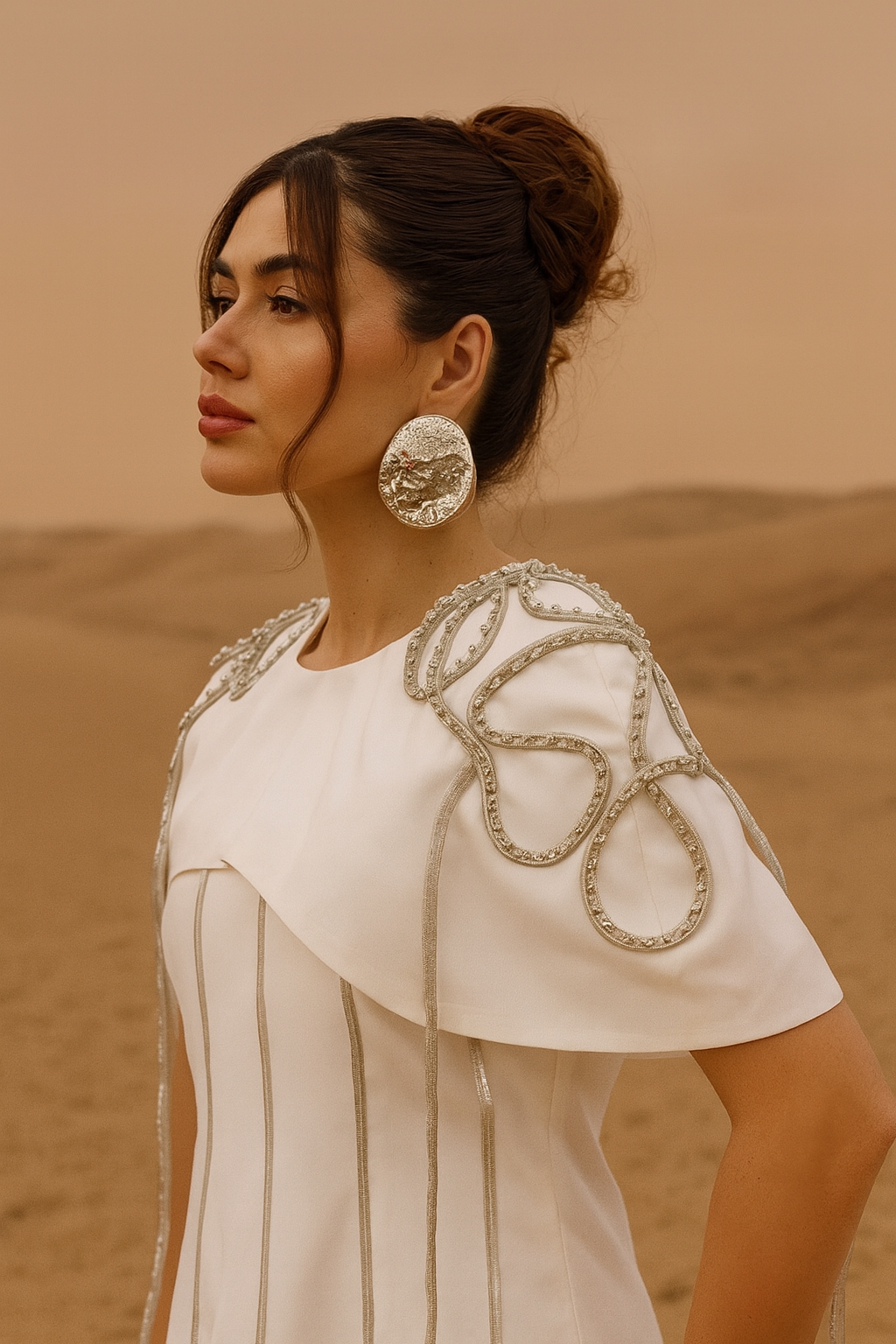 Gorgeously detailed, cape-style dress with crystal handcrafted detailing on shoulders and metallic stripes on the dress.