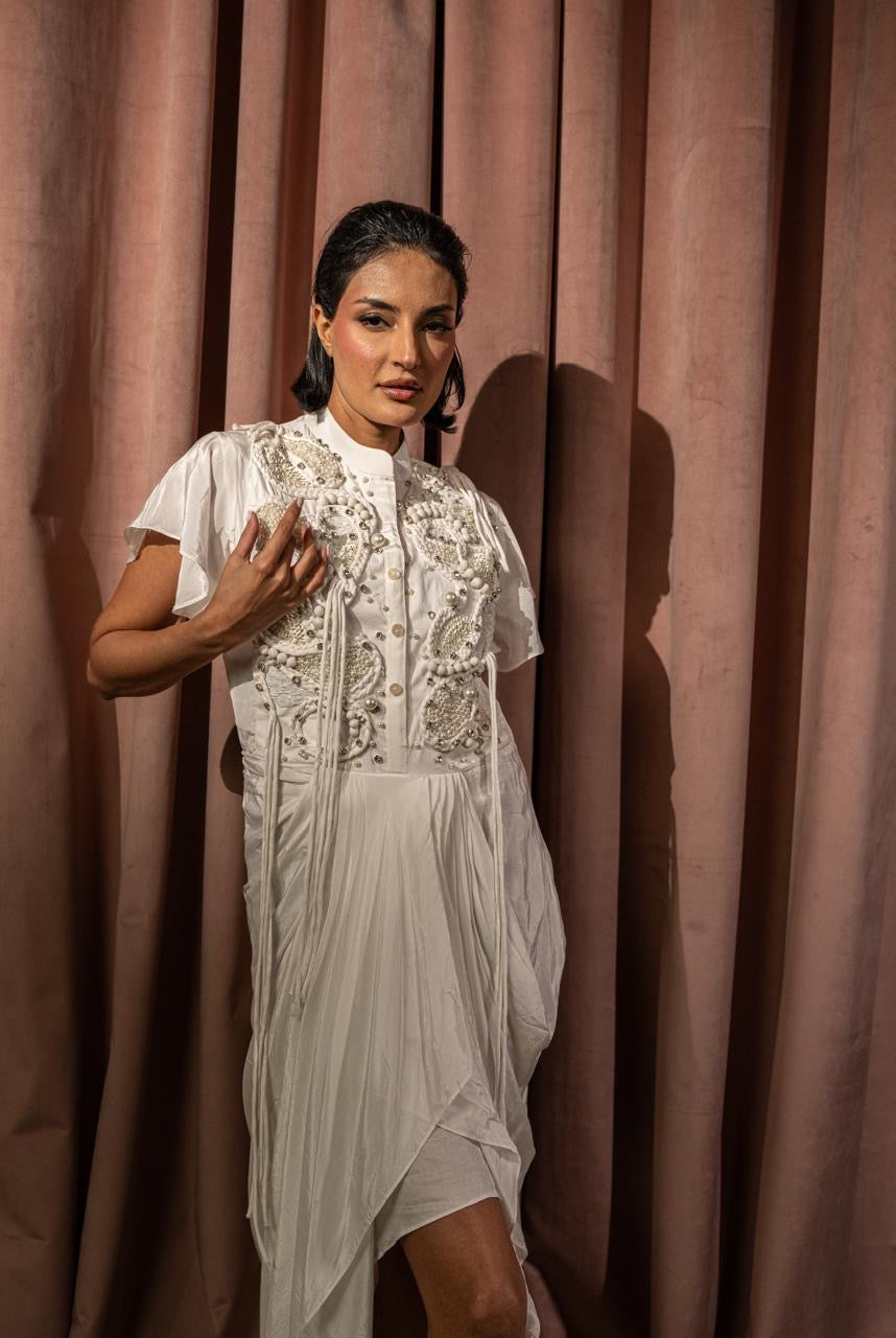 Ivory Draped dress with handcrafted texture details on yoke and fringe. It features a soft drape style silhouette.