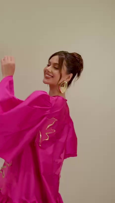 Silk-taffeta trapeze dress with our signature 3 dimensional floral applique and metallic highlights on front and back. The dress has a loose, relaxed fit and features statement, pleated sleeves.