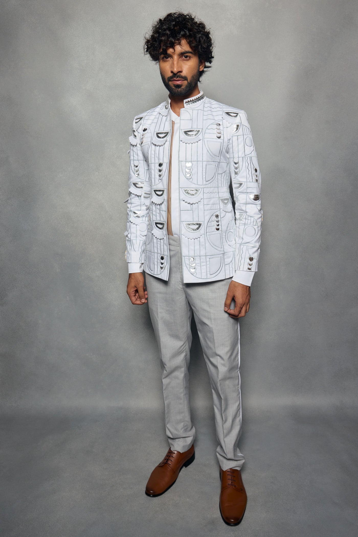 Short blazer with all over embroidery, 3d applique and leather details with pants