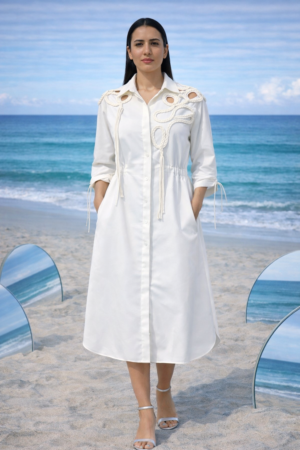 TWILL-COTTON, BELTED SHIRTDRESS WITH TEAXTURED FRINGE DETAILING AND CUTWORK ON SHOULDER AND SLEEVES.
